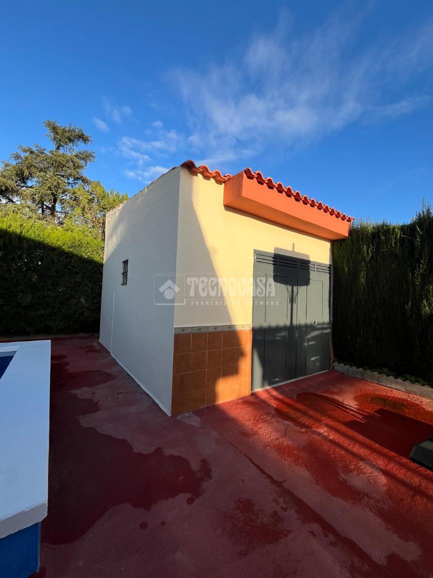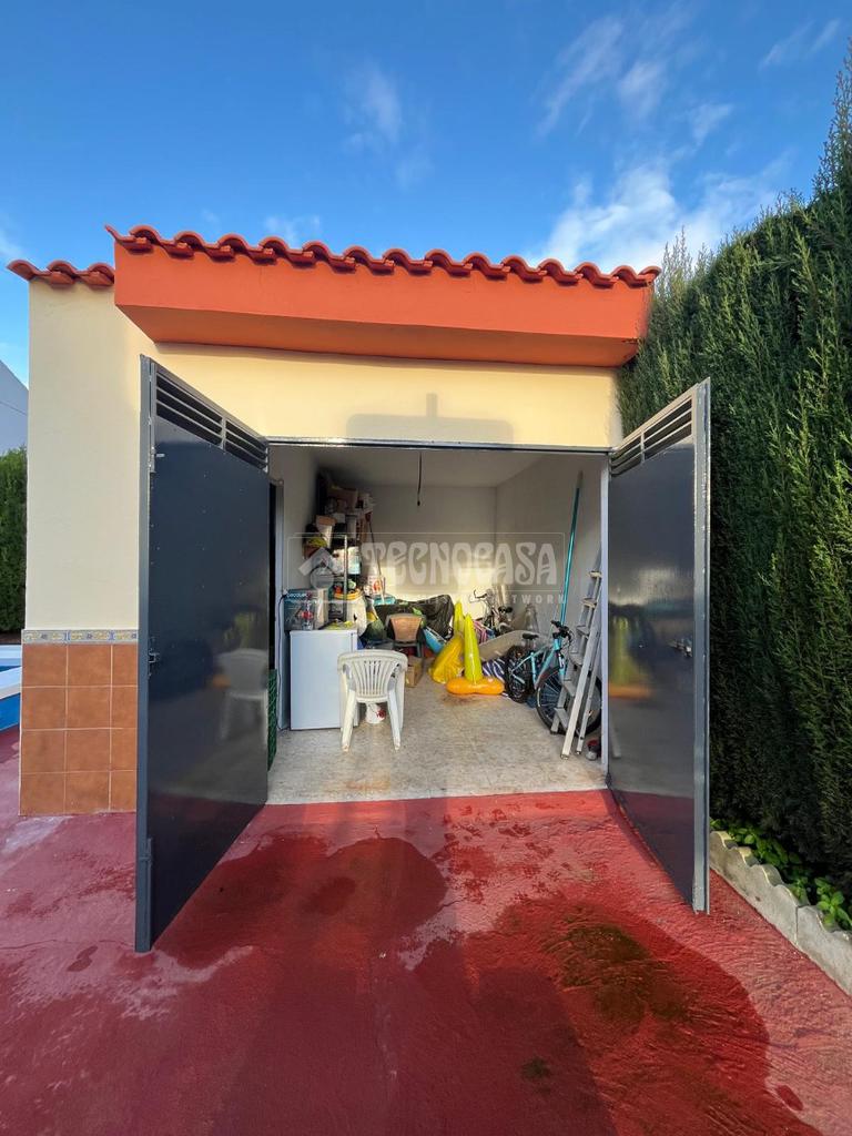 En el exterior encontramos un agradable porche, una piscina privada y varias zonas de almacenaje: un almacén de 22 m² y otro de 18 m², ideales como trastero, taller o espacio adicional.